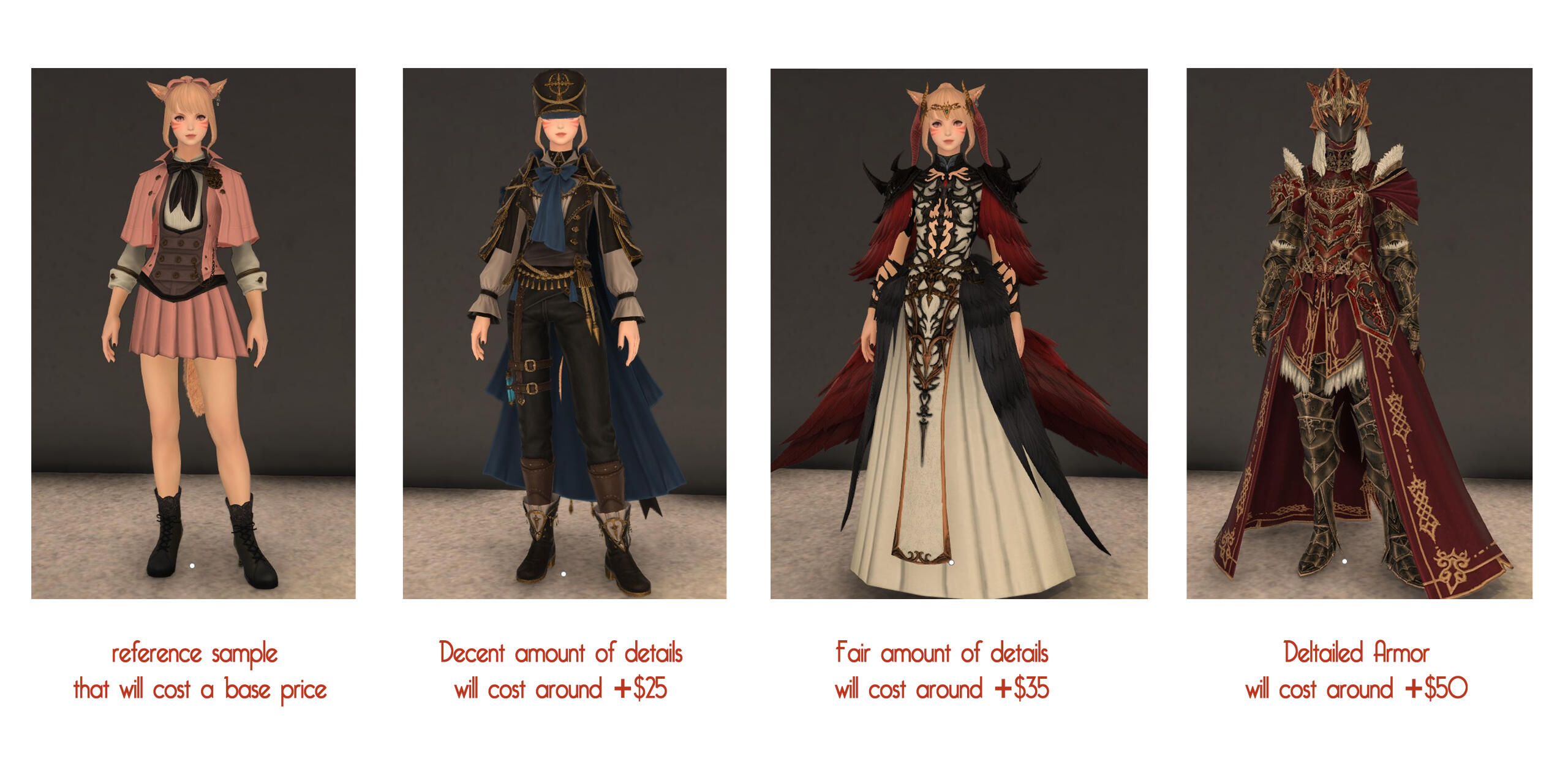 This is pricing example of Outfit Details and Properties. Hopefully this is will help to give an idea how much for the character that you want to commission.